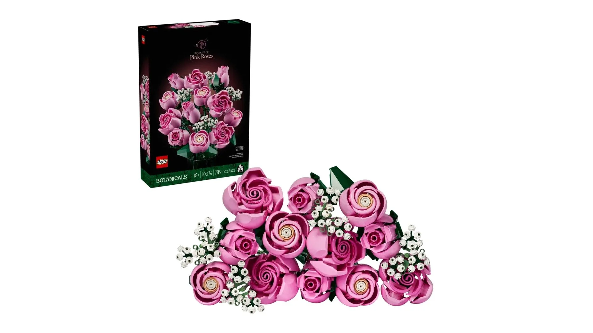 Disponibile dal 1 ottobre, il Bouquet di rose rosa è la deliziosa controparte del famoso mazzo di rose rosse, offrendo un set elegante e romantico composto da 789 pezzi per creare 12 rose in diverse fasi di fioritura. Arricchito da rametti di gipsofila bianca e un'incantevole tonalità di rosa.